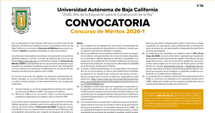 La Universidad Autónoma de Baja California invita a participar en el Convocatoria de los Concursos de Oposición Cerrado y Méritos 2026-1 para ocupar plazas definitivas.
